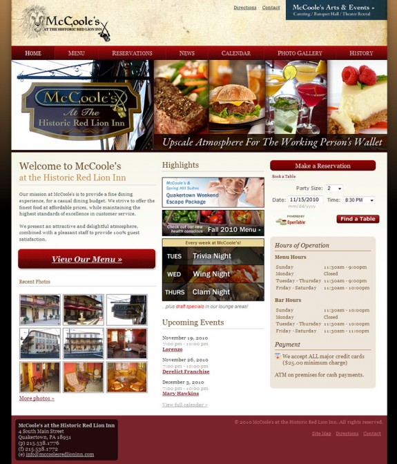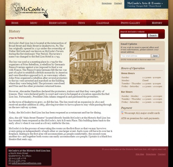 McCoole’s at the Historic Red Lion Inn is a restaurant and theater/event space in Quakertown, PA. They contacted me for a much needed redesign of their existing web presence.